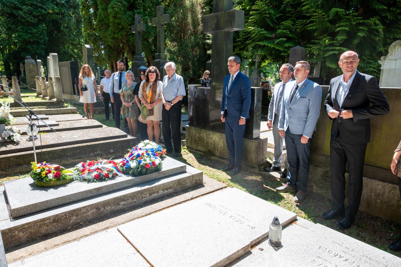 Pietny akt kladenia vencov pri hrobe Milana Hodžu na Národnom cintoríne v Martine .