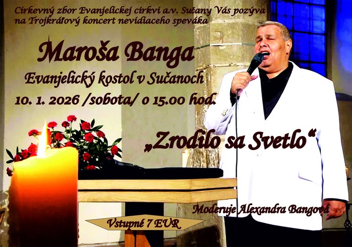 Cirkevný zbor Evanjelickej cirkvi a. v. v Sučanoch srdečne pozýva všetkých občanov a priaznivcov dobrej hudby na koncert známeho slovenského nevidiaceho umelca a tenoristu Maroša Banga.