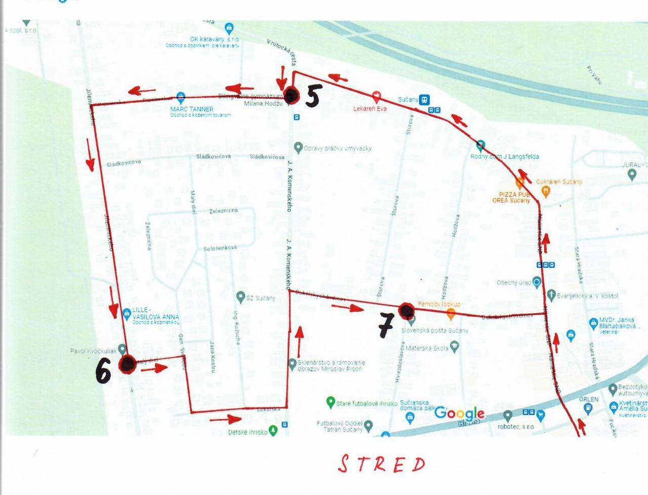 3. Detské ihrisko Prefa Sučany - cca o 12:00 hod. Pokračuje cez ul. Pod Brezinou na ul. Štiavnickú cesta , Československej armády, na stanovište
