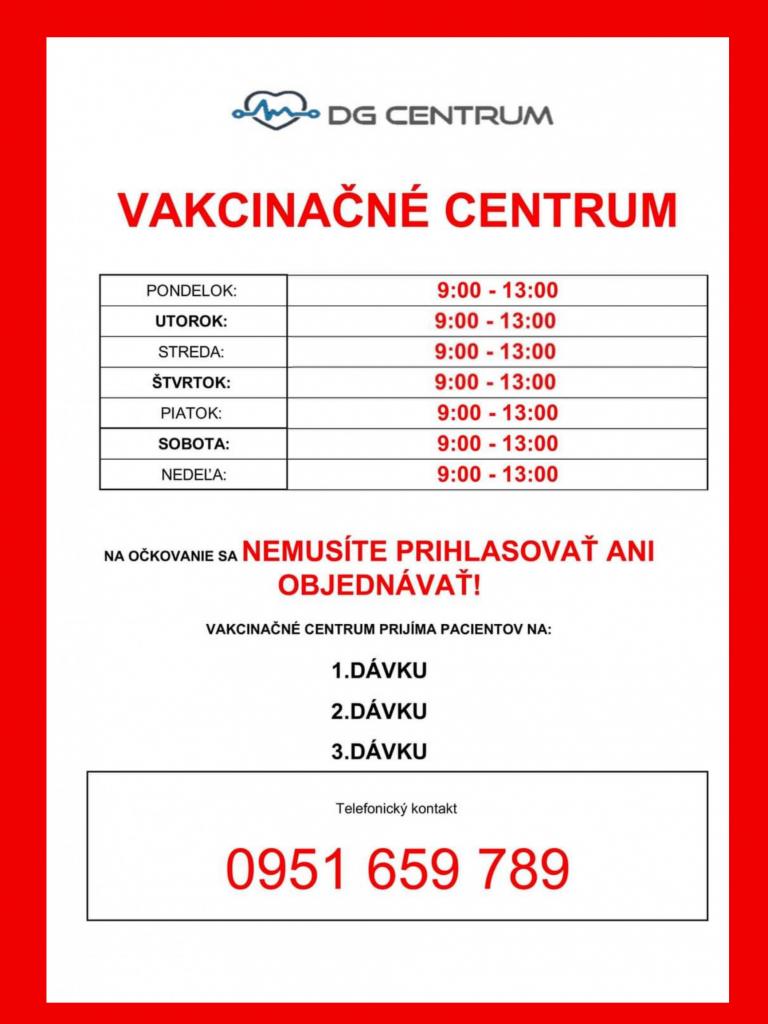 Očkovanie proti Covid-19 je možné k očkovaniu bez prihlasovania a objednávania v DG centre: POLIKLINIKA - dg.centrum, Prieložtek 1, Martin, budova polikliniky SENIUM, vstup oproti vchodu do polyfunkčnej budovy OLYMP, t.č. 043/4224430. Aktuálne ordinačné hodiny vakcinačného centra sú v prílohe.