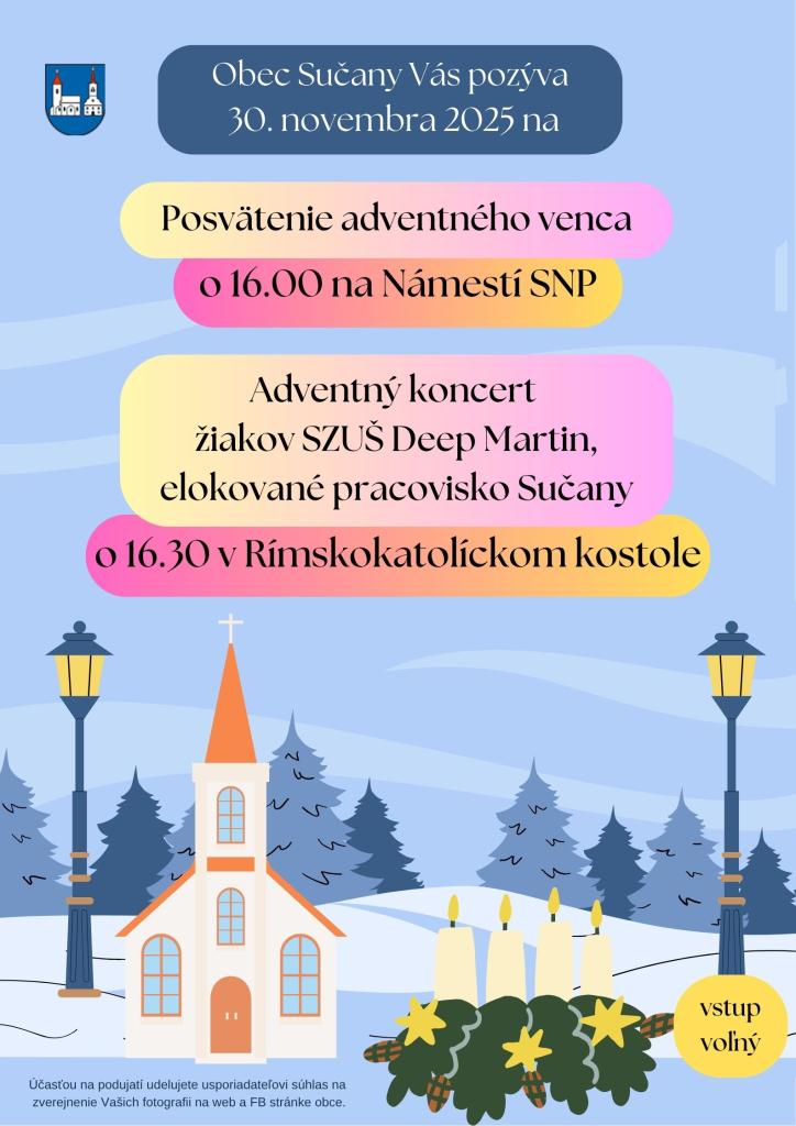 Obec Sučany vás srdečne pozýva na posvätenie adventného venca a zapálenie prvej adventnej sviečky,