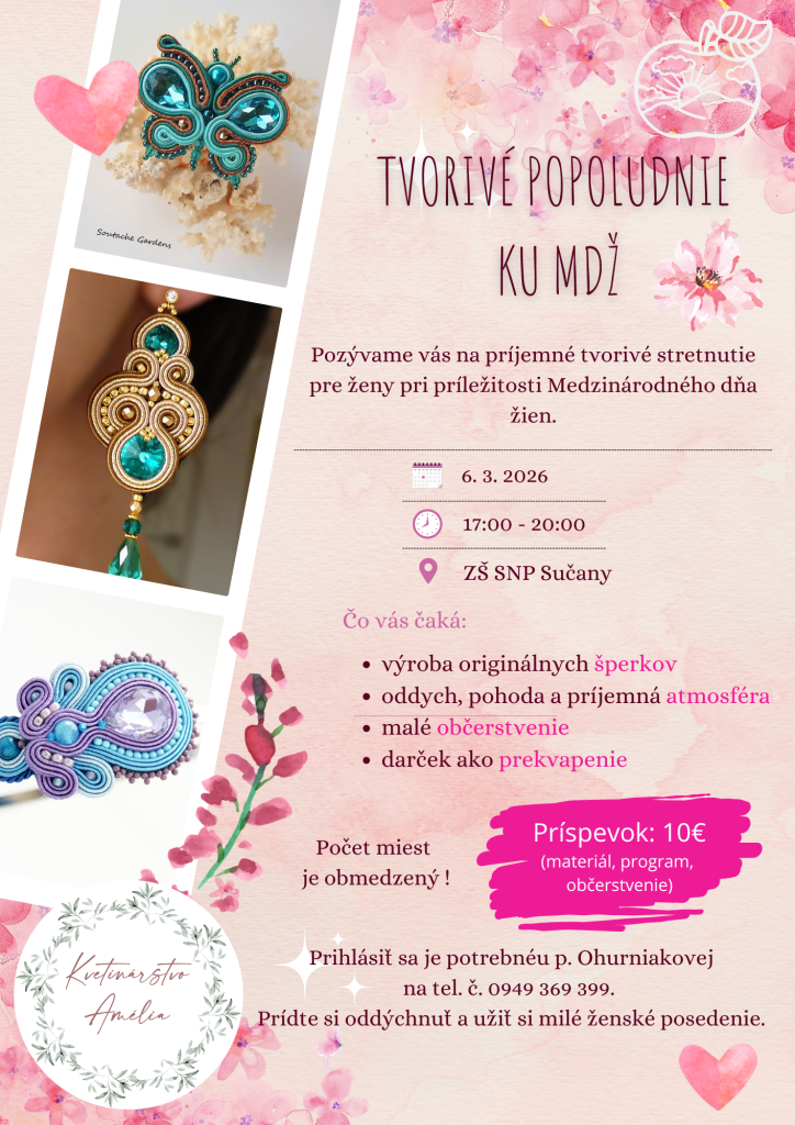Základná škola SNP v Sučanoch pri príležitosti Medzinárodného dňa žien srdečne pozýva všetky mamičky, staré mamy a dámy z našej obce na príjemné tvorivé popoludnie. Príďte si oddýchnuť od každodenných povinností a v spoločnosti dobrých susediek si vytvoriť niečo pre radosť.
