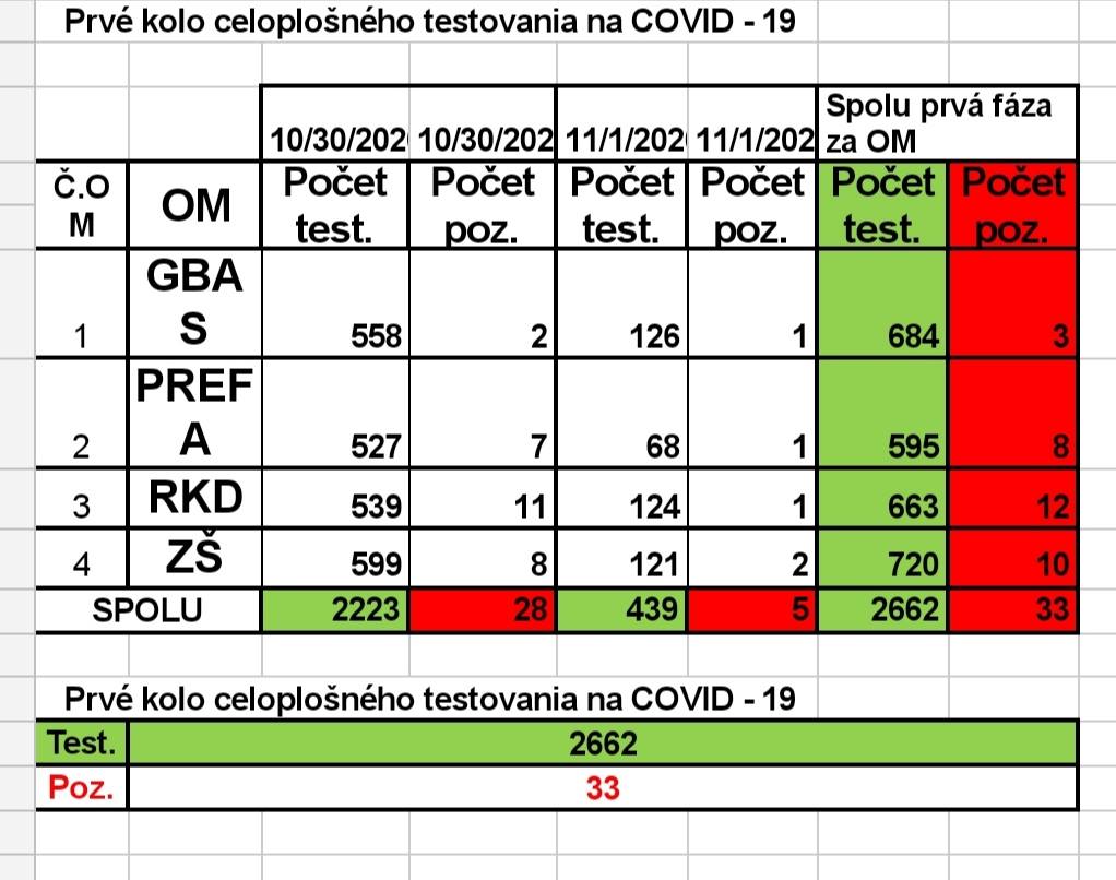 (testovaní boli aj obyvatelia iných obcí a okresov: testovaných bolo 2662 osôb, z toho pozitívnych bolo 33.