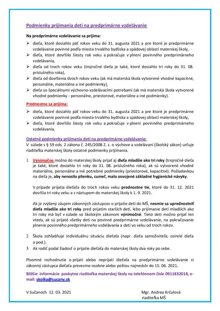 Riaditeľstvo Materskej školy Sučany, Hurbanova 10 oznamuje rodičom,