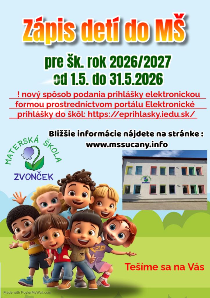 riaditeľstvo Materskej školy Zvonček v Sučanoch oznamuje, že podávanie žiadostí o prijatie dieťaťa na predprimárne vzdelávanie pre školský rok 2026/2027 sa uskutoční v termíne od 01.05.2026 do 31.05.2026
