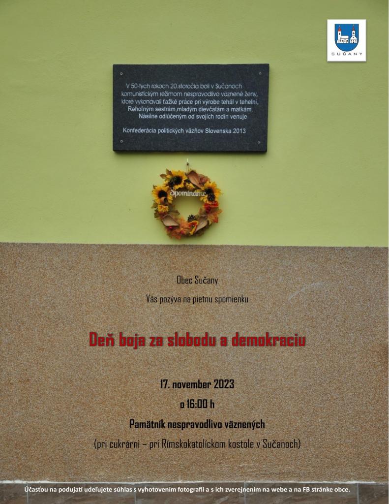 Obec Sučany Vás pozýva na pietnu spomienku, ktorou si pripomenieme nekrvavé udalosti, ktorých dôsledkom bolo odstránenie Komunistického režimu v Česko-Slovensku - 17. novembra 2023 o 16:00 h pri pamätníku nespravodlivo väznených /pri cukrárni - pri Rímskokatolíckom kostole v Sučanoch/.