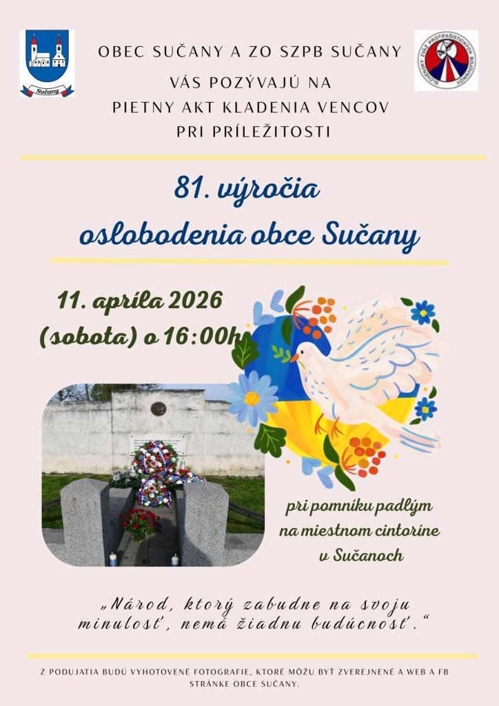 Obec Sučany v spolupráci so Základnou organizáciou Slovenského zväzu protifašistických bojovníkov v Sučanoch Vás srdečne pozývajú na spomienkové stretnutie pri príležitosti 81. výročia oslobodenia našej obce.