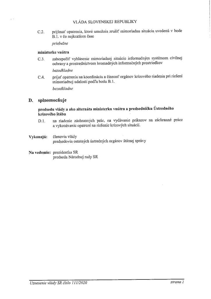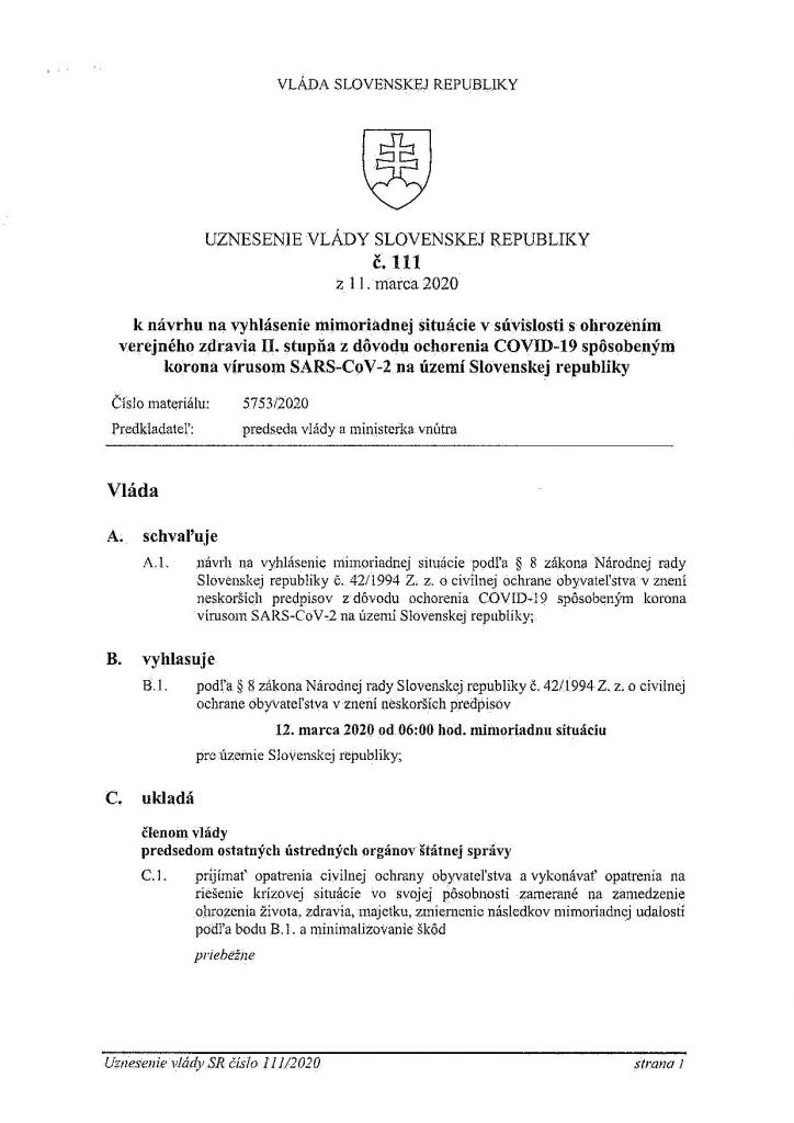 Uznesenie vlády Slovenskej republiky č. 111 z 11.marca 2020