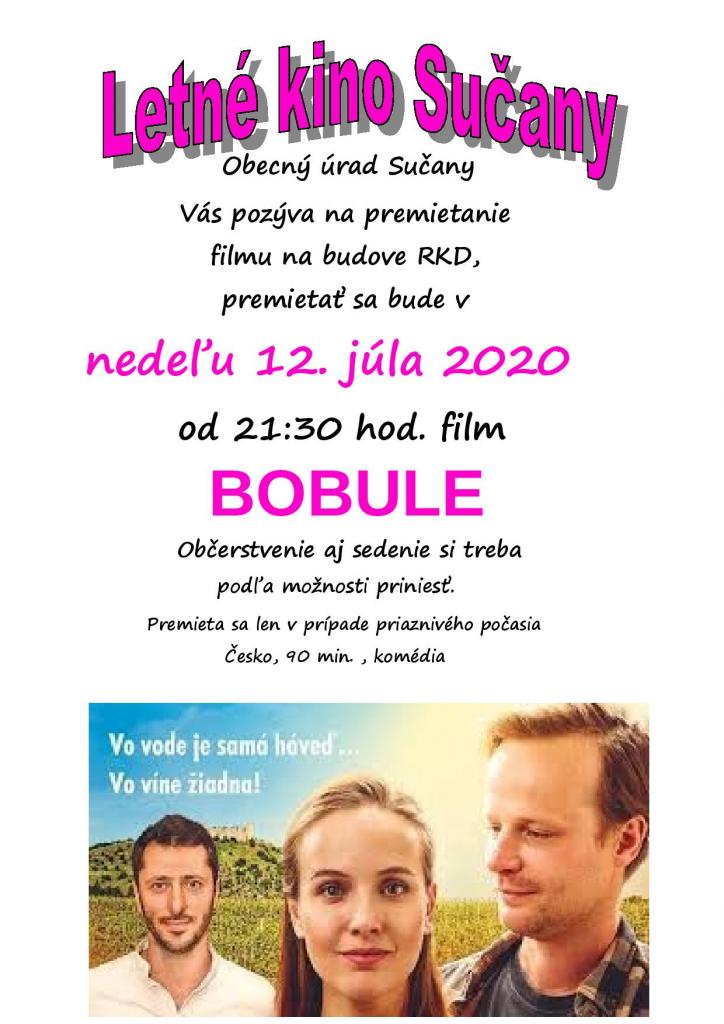 Pozvánka Obecný úrad Sučany Vás pozýva na premietanie filmu na budove Robotníckeho kultúrneho domu . Premietať sa bude v nedeľu 12.júla 2020 od 21:30hod. film BOBULE (Česko, 90min., komédia). Občerstvenie aj sedenie si treba podľa možnosti priniesť. Premieta sa len v prípade priaznivého počasia.