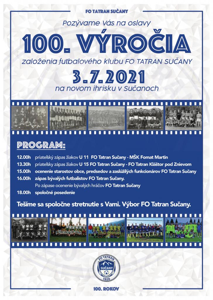 FO Tatran Sučany pozýva svojich hráčov,bývalých hráčov a svojich priaznivcov na oslavu 100.rokov organizovaného futbalu v Sučanoch v Sobotu 3.7.2021 na novom ihrisku v Sučanoch.
