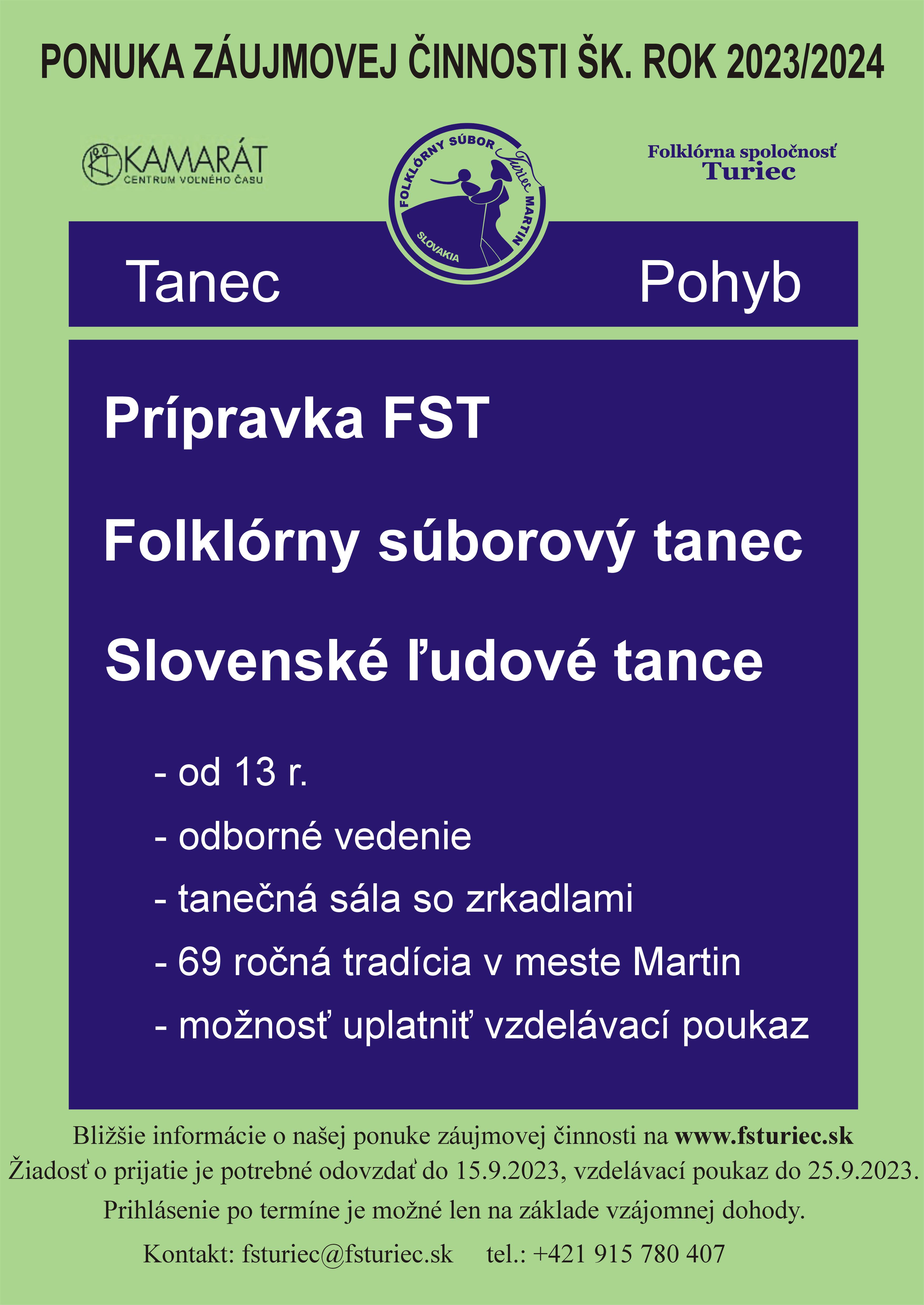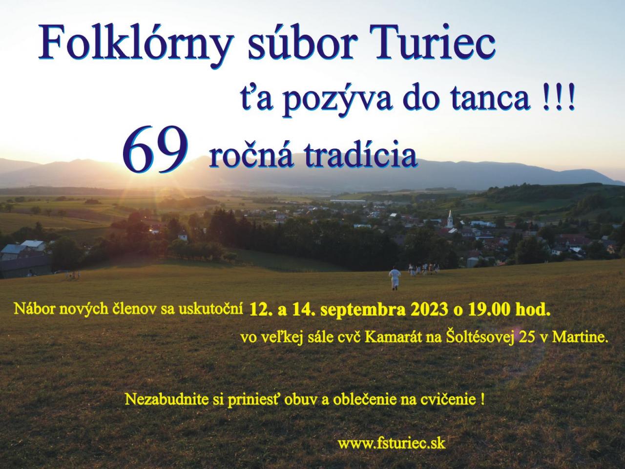Folklórny súbor Turiec Vás pozýva na Nábor nových členov, ktorý sa uskutoční v dňoch 12. a 14. 9. 2023 o 19:00 h vo veľkej sále CVČ Kamarát na Šoltésovej 25 v Martine. Nezabudnite si priniesť obuv a oblečenie na cvičenie. Bližšie informácie v prílohe a na: www.fsturiec.sk