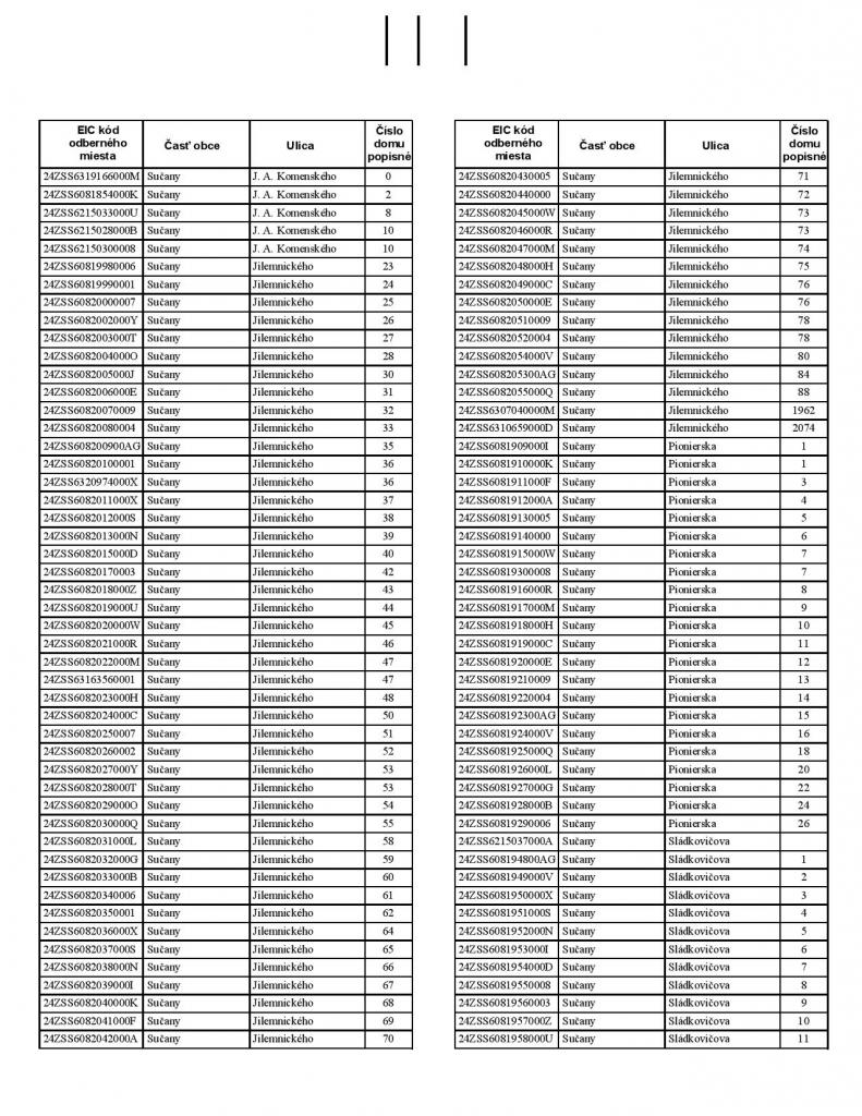 Stredoslovenská distribučná spoločnosť oznamuje, že v zmysle ustanovenia § 31 odsek 2 písm. t) zákona č. 251/2012 Z.z. o energetike a o zmene a doplnení niektorých zákonov v platnom znení, bude dňa 16.10.2020 v čase od 08:00 do 13:30 hod. v obci Sučany prerušená distribúcia elektriny z dôvodu plánovaných prác na zariadeniach distribučnej sústavy prevádzkovateľa distribučnej sústavy spoločnosti Stredoslovenská distribučná, a.s., a to pre odberné miesta a lokality na ulici: